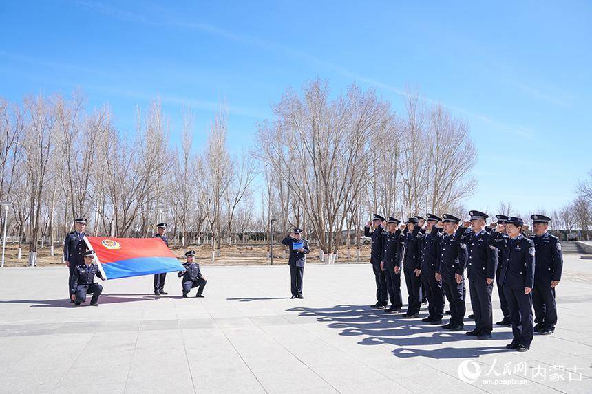 二连出入境边防检查站移民管理警察在革命烈士纪念碑前重温入警誓词。杨金烨摄