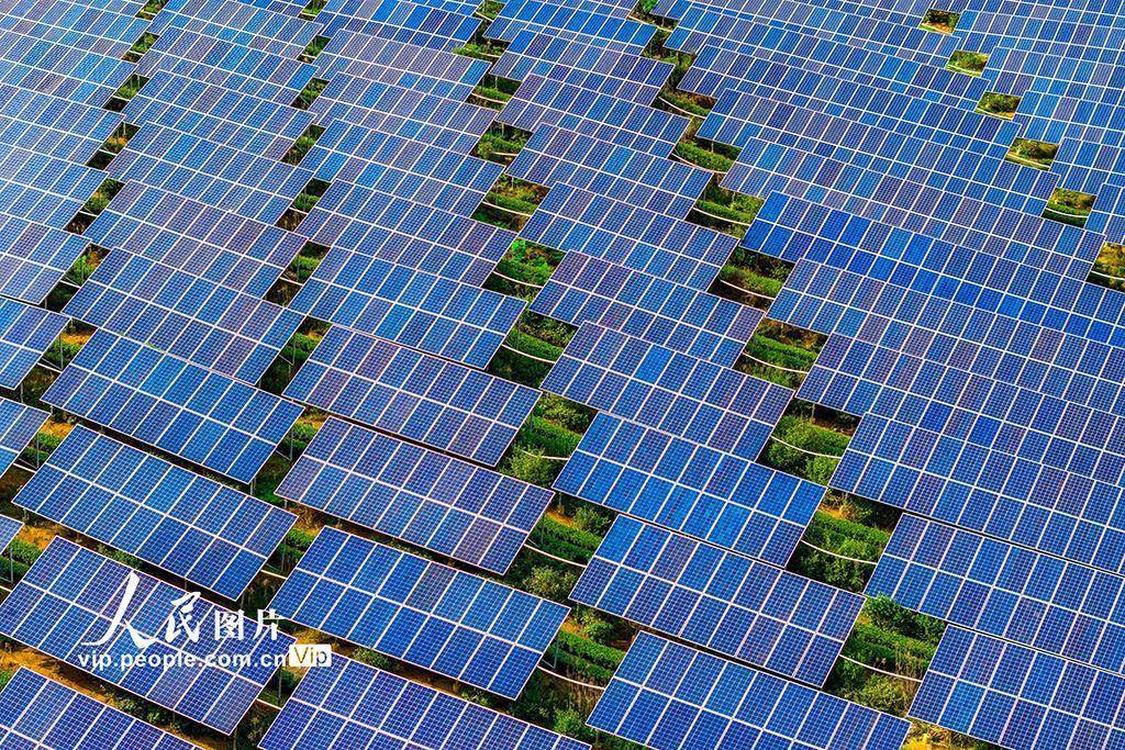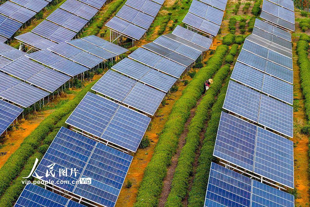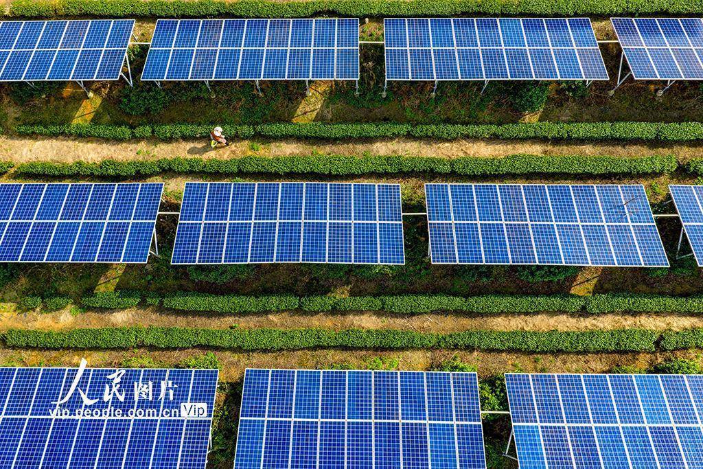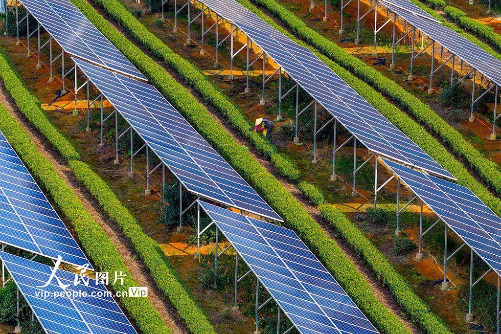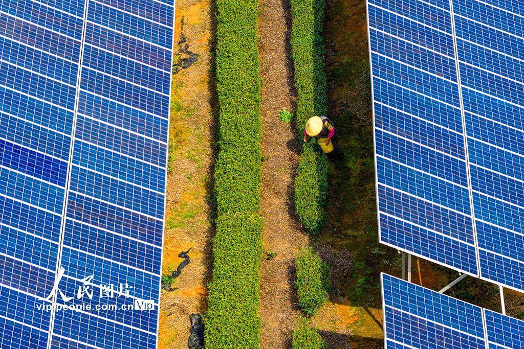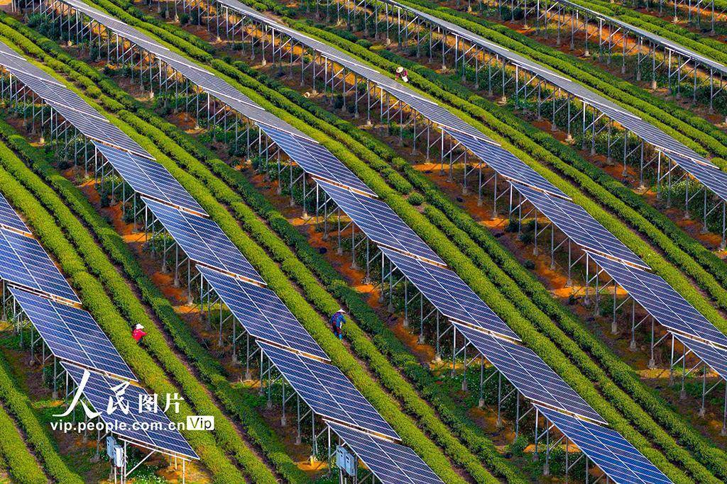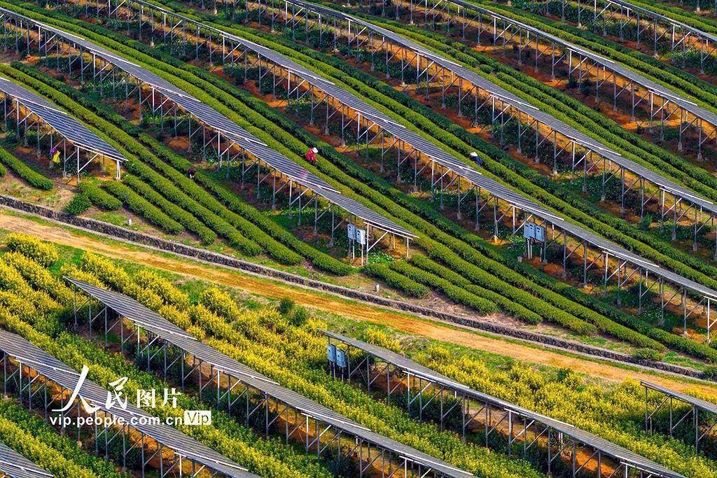 2026年4月2日,在浙江绍兴嵊州市三界镇懿晖光伏电站,茶农正在茶园中采摘茶叶。该电站采用“茶光互补”模式,将光伏发电与茶叶种植相结合,既解决了土地资源有限、地面光伏发展较慢等问题,又实现了发电无污染、不新增占地的目标,有效提升了土地立体化利用效益,达成了光伏产业与茶叶生产的双赢。潘伟峰摄(人民图片网)